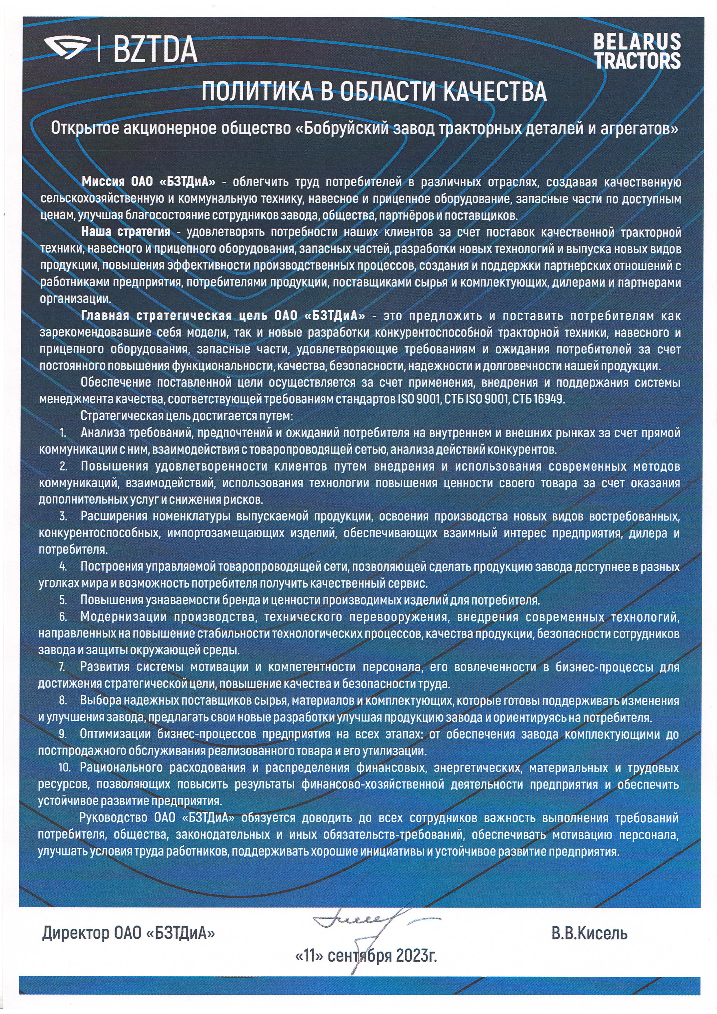 Главной целью ОАО «БЗТДиА» в области качества является создание конкурентоспособной продукции, удовлетворяющей требованиям и ожиданиям всех заинтересованных сторон, обеспечивающее стабильное финансовое положение предприятия. Достижение целей обеспечивается за счет улучшения конструкции, использования прогрессивных технологий, повышения эффективности процессов менеджмента на всех этапах деятельности и постоянного повышения компетентности персонала.
